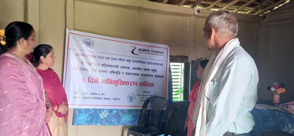 कुर्वे वुष्ट्रोको सहयोगमा मानव अधिकारका लागि महिला एकल महिला समुह सुदूरपश्चिम प्रदेशको आयोजना तथा कैलारी गाउँपालिकाको समन्वयमा स्थानीय लोकल लिडर तथा एकल महिला समुह कार्यसमितिका पदाधिकारीलाई बुधबारदेखि तीन दिने अभिमुखीकरण तालिम सुरु भएको हो ।