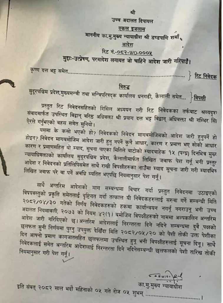 समय अगावै विना कारण सरुवा गरेपछि कृष्णदत्त भट्ट र रामचन्द्र कँडेलले उच्च अदालत दिपायलमा रिट दायर गरेका थिए । उच्च अदालत दिपायलले भदाै ५ गते मुख्यमन्त्री तथा मन्त्रीपरिषदकाे कार्यालय सुदूरपश्चिम प्रदेशका नाममा अल्पकालिन अन्तरिम आदेश जारी गरी प्रदेश सरकारकाे साउन ३० गतेकाे सरुवा निर्णय कार्यान्वयन नगर्न भनेकाे छ ।